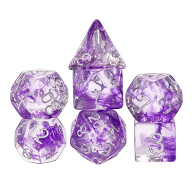 7-dice set of purple, blue, green and clear semi-transparent resin. These dice can sometimes appear different to pictured set.