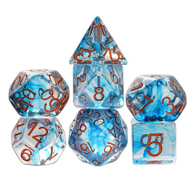 Our handcrafted dice are clear semi-transparent resin 7-Die Dice Set includes one of each D4, D6, D8, D10 0-10, D10 00-90, D12, D20