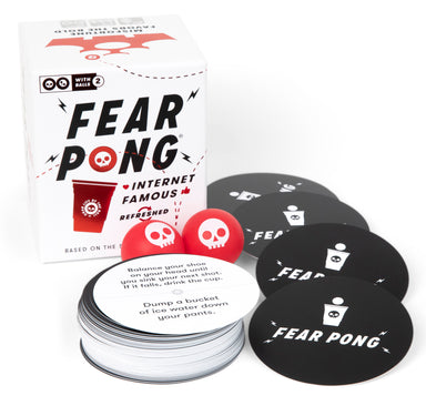 Fear Pong base game contains: 215 bold & bitter dares, on 108 waterproof cards Plus 12 more blank cards, to write your own dares And 2 red ball...