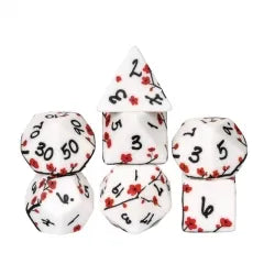 Our handcrafted dice are hand polished to keep their beautiful edges. These dice are covered in miniature Plum Blossoms. 7-Die Dice Set includes o...