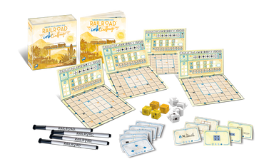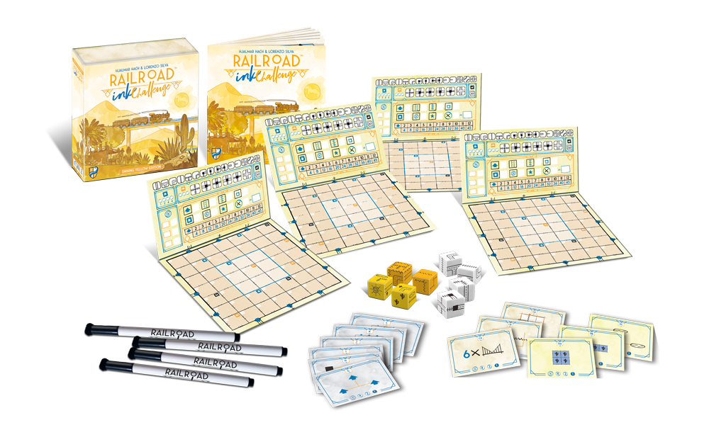 Railroad Ink Challenge is a quick-playing roll-and-write game for 1 to 4 players. Grab a board and a dry-erase marker, and get ready to reach networking nirvana! Roll the dice and draw the routes to connect the exits around your board. Expand your network with railways, highways and stations to collect points, but you will be penalized for any open connections, so plan carefully!