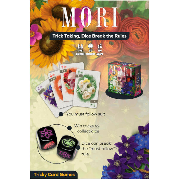 The Mori Board Game is a quick-playing trick-taking game that asks players to carefully manipulate their hand of cards by playing tricks and using dice to find their way to the best possible score.