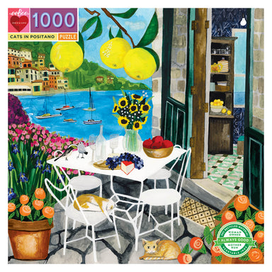 eeBoo 1000 pc puzzle – Cats in Positano Puzzle size: 58.4 x 58.4 cm Box Size: 28 x 28 x 5 cm Made of 90% recycled greyboard printed with vegetable...