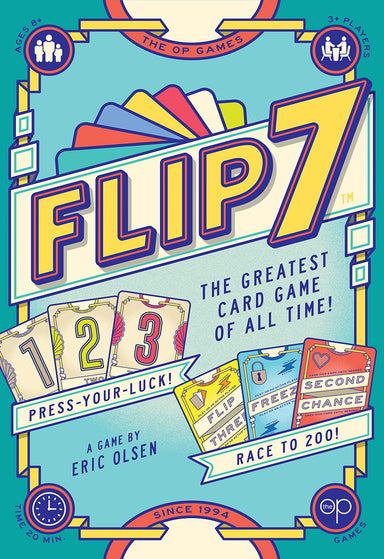 Sounds simple, right? Not so fast! In Flip 7™, the deck is anything but ordinary. There’s only one 1 card, two 2's, three 3's, and so on, along with special cards that can earn you extra points, give you a second chance, or stop you—or your opponents—in your tracks. Will you play it safe and bank your points before busting, or take a risk and go for the bonus by flipping seven in a row? Combining luck and strategy, this addictive card game will quickly become a favorite!