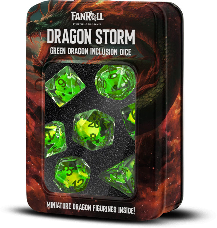 Dragon Storm inclusion dice feature the head of a dragon perfectly captured in each die. Each full-sized, 16mm resin set comes with 7 dice (d4, d6, d8, d10, d10% (00-90), d12, and d20).