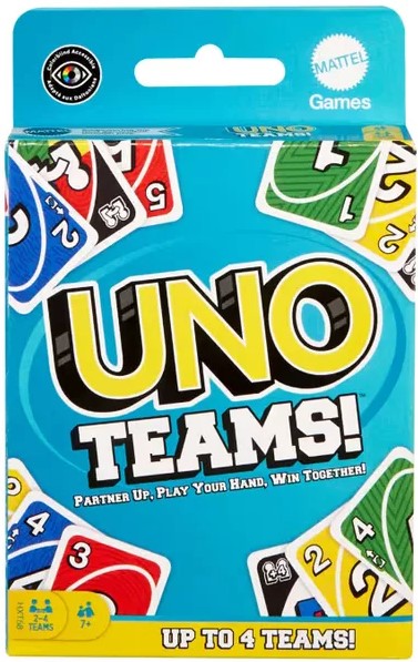 UNO Teams is a new way to play the classic game! Players still match color, number and symbol but instead of every-man-for-himself, they team up in pairs of two and play together to win. Special cards and rules help teammates work together, but both players must get rid of all the cards in their hands to win. And remember, when you (or your partner!) are down to your last card, don't forget to yell 'UNO!'
