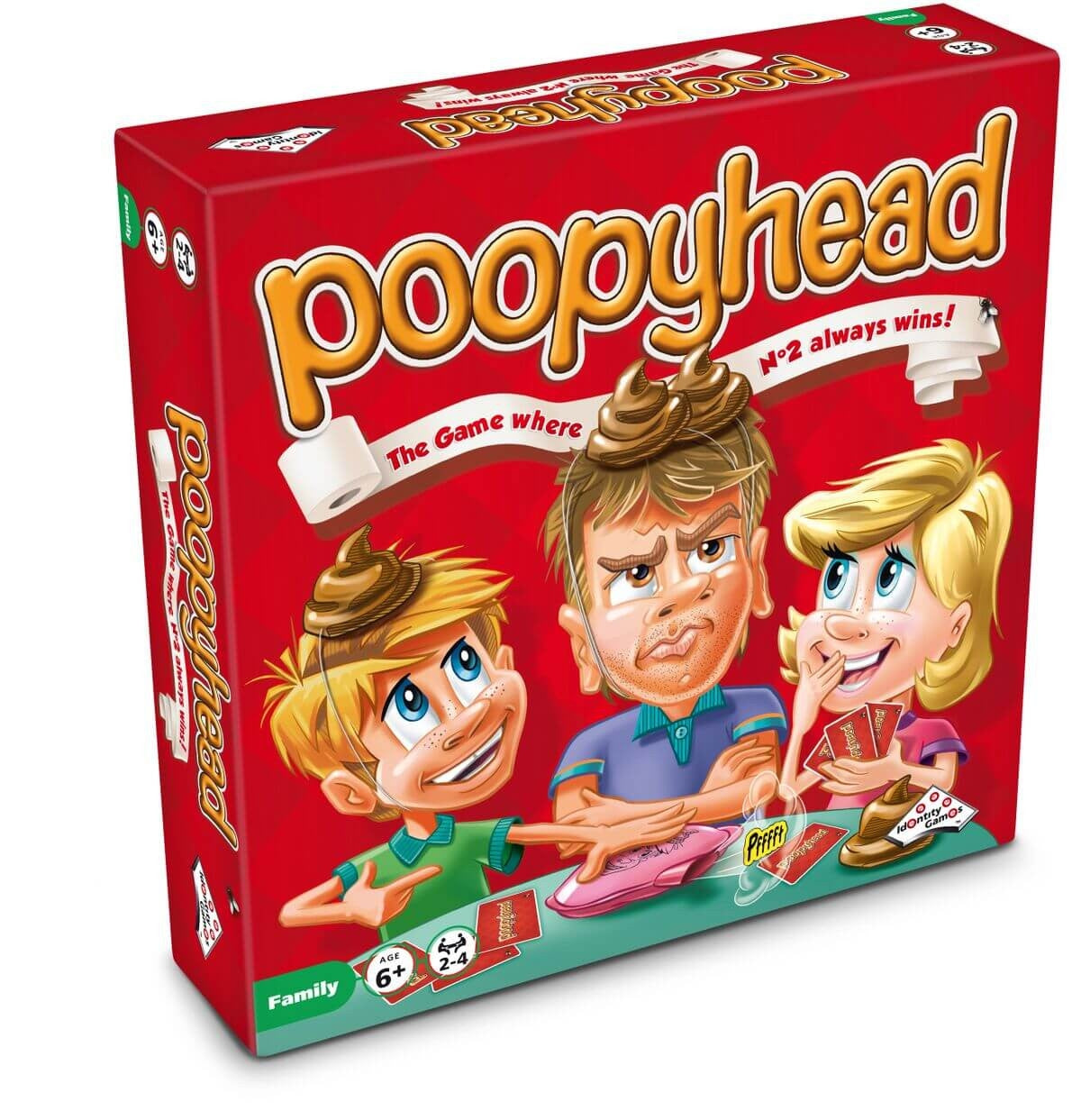 Try to beat your opponent in this lightning fast card game. Everybody tries to put down as quick as possible and in the right sequence: Toilet, Turd, Toilet Paper, Washing Hands (with no two cards of the same colour being allowed on top of each other). When a player has no more cards or cannot play anymore he hits the whoopie cushion. The player with the most cards left gets a fake turd (point) and a new round starts. The person with the fewest turds/points at the end of the game wins.