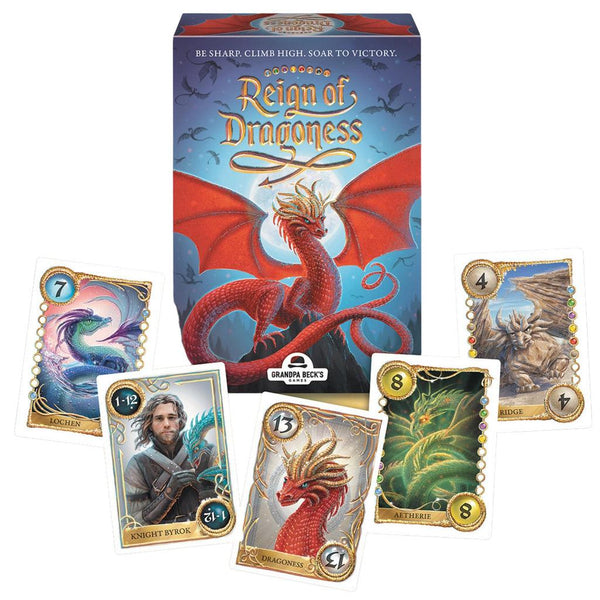 Celebrate the Reign of Dragoness by being the first to play all thirteen cards in your hand. Each player must both match the pattern and raise the value of the cards until all but one drop out of the challenge. The Winner of each challenge sets the pattern for what comes next, and play continues until one player's hand is empty. Players collect points for playing all their cards first, and the player with the most points at the end of the game is dubbed Grand Champion of the Dragoness!
