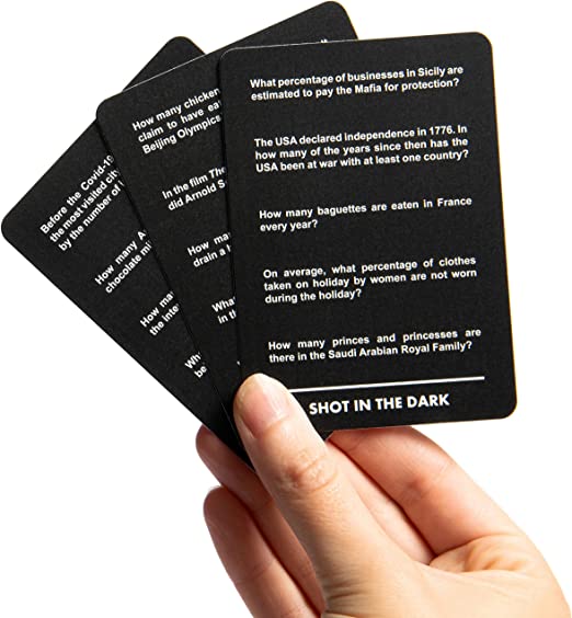 Shot in the Dark is the ultimate quiz game. 400 bizarre questions and amazing answers on small lightweight cards. Ideal for playing with friends or family. Ever wondered: how many tins of paint it takes to paint the White House, how much vodka the average Russian drinks, or what proportion of European babies are conceived in an Ikea bed? If so, then this game is for you.