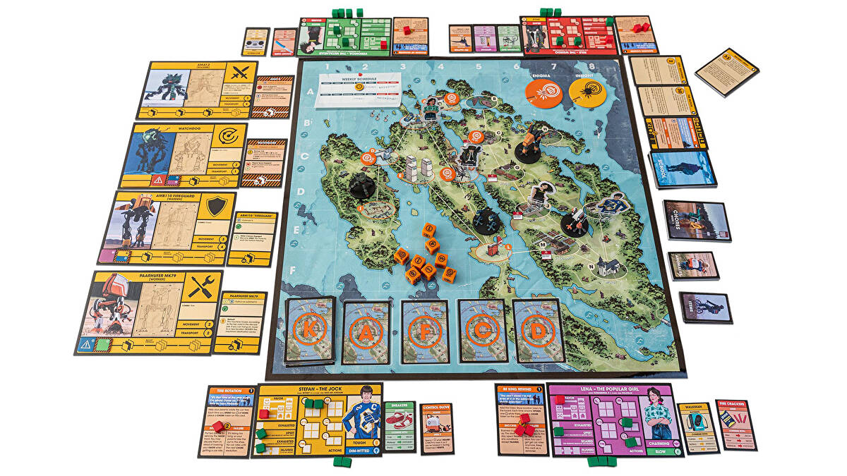 In the Tales From the Loop - The Board Game, you take the roles of local kids and play cooperatively to investigate whatever phenomena that threaten the islands (or perhaps just the local video store), and hopefully stop them. Each day starts at school, but as soon as the bell rings you can use whatever time you have before dinner and homework to go exploring! Player actions are integrated, meaning there’s no downtime as you wait for others taking their turn. It also makes cooperating with your fellow players dynamic as you can react to things that happen in a turn and don’t have to plan it all out from the start.